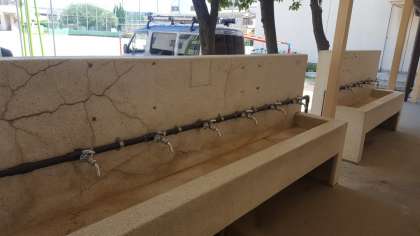 給食室前の手洗い場も、蛇口が新しくなっています。