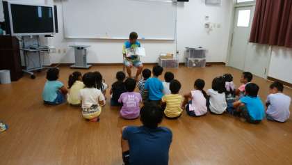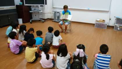 シンちゃんの登場で楽しくスタートしたサマースクールです。次は、平和に関する絵本の読み聞かせです。児童たちにとって、平和について考える機会になりました。