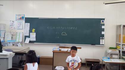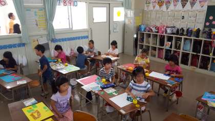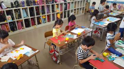 1年生が、小さな手を一生懸命使って紙工作に取り組んでいます。