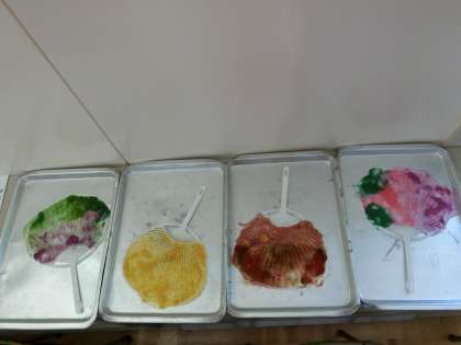 スライムをつくり、それに花紙を混ぜてうちわの骨組みにはりつけました。