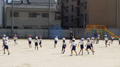元気いっぱい、『しっぽ』をつけた子どもたちが走り回っています。