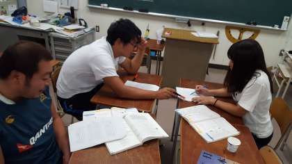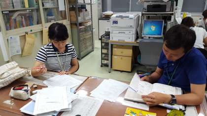 先輩教員がリードしながら、新任教員・教育実習生と算数科の教材研究中です。