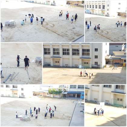 力を合わせて、運動会に向けて運動場の整備を進めています。