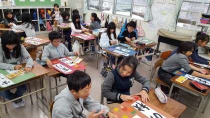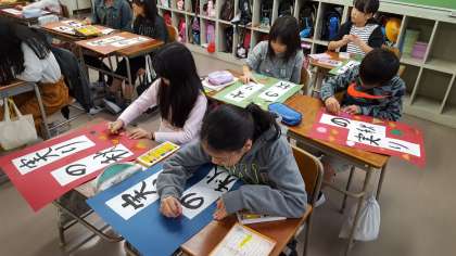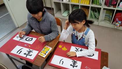 習字で書いた「実りの秋」にパスで絵を描き足し、アート作品に大変身させています。