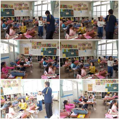 音楽科で「わらべうた」に合わせて手遊びをしています。