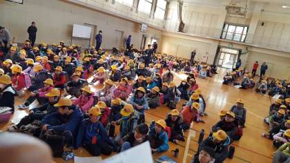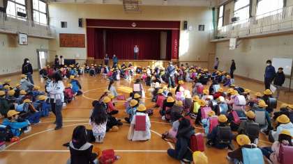 前回から講堂に集まり、地区別に並んで下校になっています。