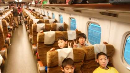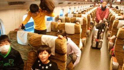 5分遅れて、新大阪駅を出発しました。新幹線さくらは、快適です。ほら、笑顔がいっぱいです!