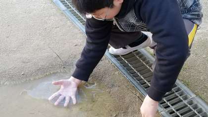 昨夜から今朝の寒さで、運動場にある小さな水たまりに氷ができています。