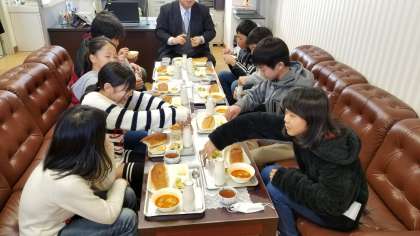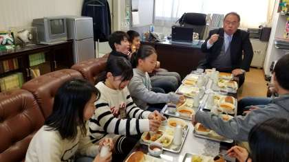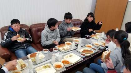 校長先生と一緒に、もうすぐ進学する中学校での豊富について話しながら楽しく給食を食べています(*'▽')