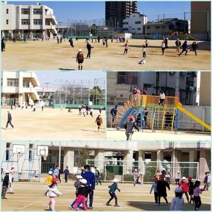 運動場では、1年生が6年生と一緒に遊ぶ姿が見られます(*'▽')