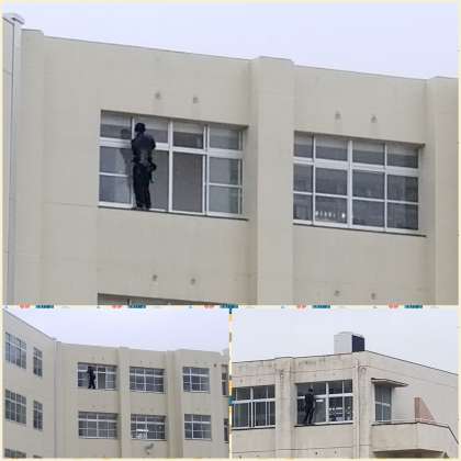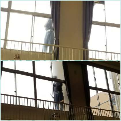 朝から専門家の方たちに、高所窓清掃に取り掛かってもらっています。