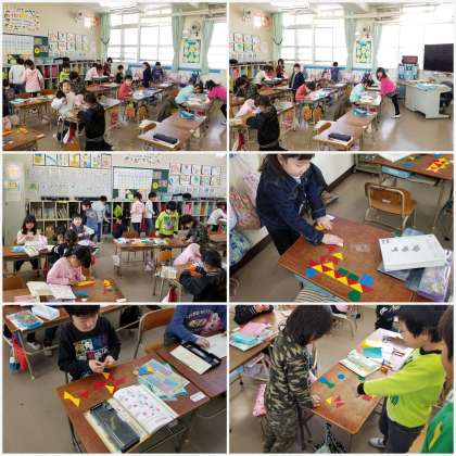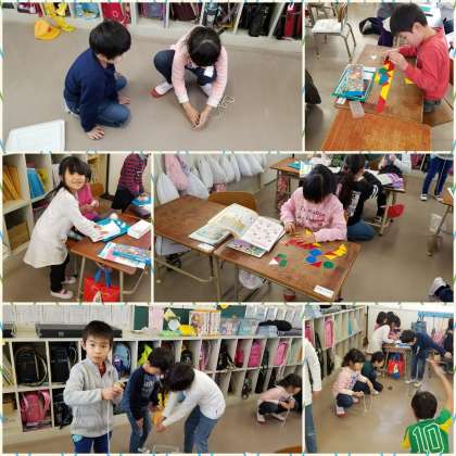算数科で学習した形づくりや粘土遊び、地域の方に教えていただいたコマ回しなど、工夫をしながら休み時間を過ごしています。