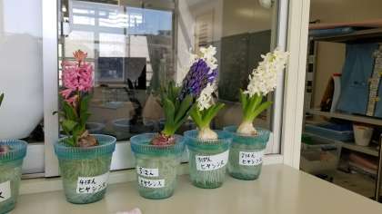 教室前には、子ども達が世話をしているヒヤシンスが咲いています。