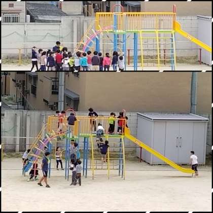 1年2組がコンビネーション遊具の使い方を聞いた後、とっても楽しそうに遊んでいました。