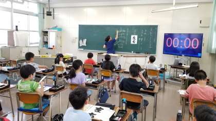 2組の担任が、1組で習字の学習をしています。