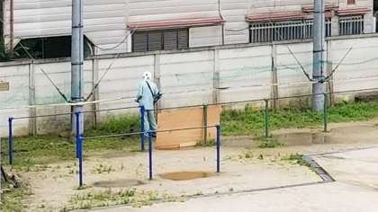 雨が止んだ合間をぬって、校庭の雑草を刈る作業をしています。
