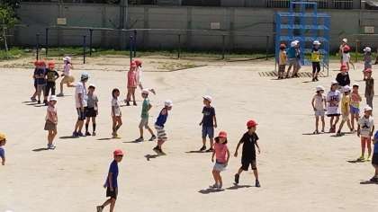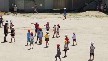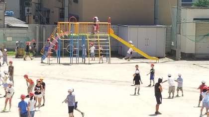 子ども達は、暑さに負けず元気いっぱいに運動場で遊んでいます。