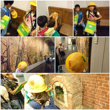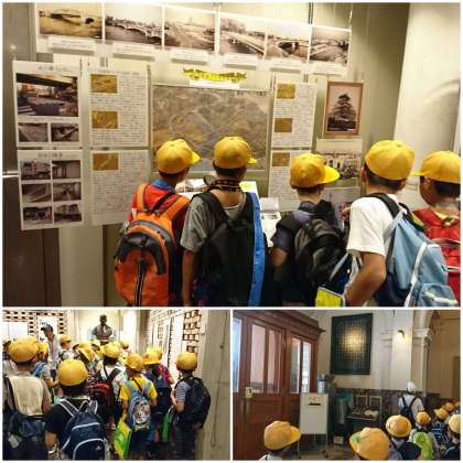 中央公会堂に縁のある人について学んだり昔の椅子(座面をあげると帽子がしまえる)に座ったりしています。
