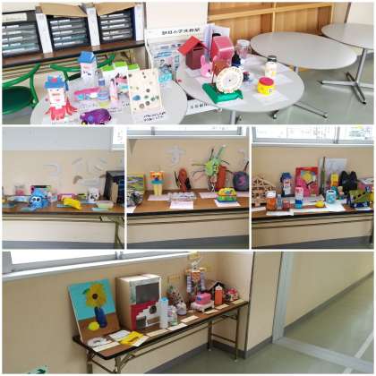 職員室横の廊下に、夏休みの工作を展示しています。