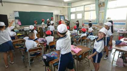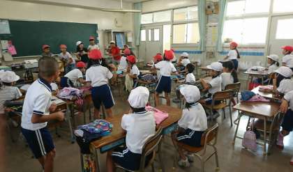 応援団が、低学年の教室に「出前練習」に行きました。