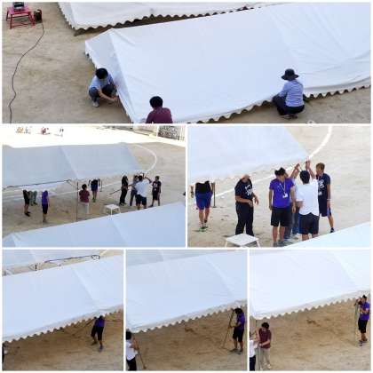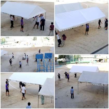 応援団の練習に負けないくらいパワーを発揮して、教職員がテントを設置しています。