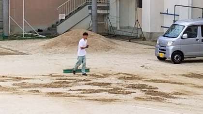 運動場の側溝にたまった土を取り出し、運動場の整備に再利用しています。