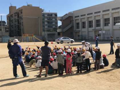 1〜3年生は、運動場で道路の安全な歩き方や交通ルールについて学んでいます。