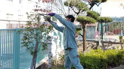 校舎周りの植木の選定をしています。
