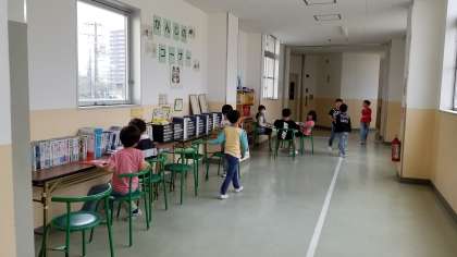 職員室横では、1年生が丸テーブルを囲んで絵本を読んだり、漢字検定のプリントに挑戦したりしています。