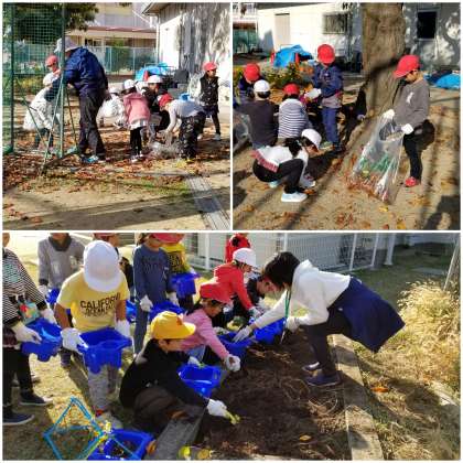 クリーンピックの時間を使って、落ち葉拾いと同時進行で球根を植えています。