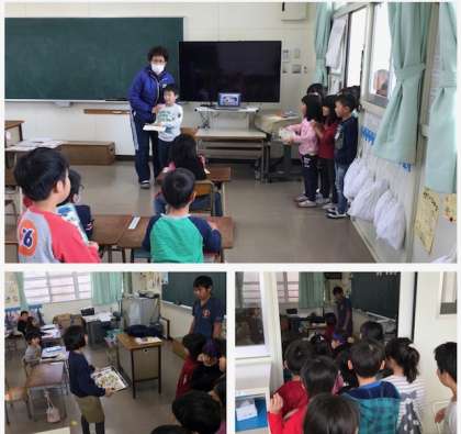 2年生が生活科の「お芋パーティ」で作ったスイートポテトを、1年生におすそ分けしています。