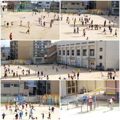 経年調査に取り組んでいる3〜6年生は、気分転換に思いっきり運動場を走り回っています。