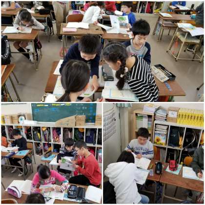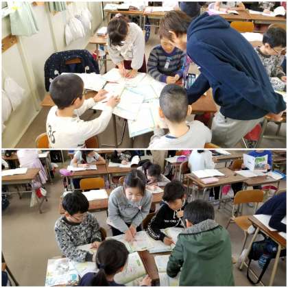 友達と一緒に、教科書にある「はかりの目盛」を読んでいます。