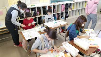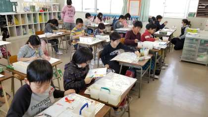 国語の教科書にある好きな作品の一場面を絵に描いています。