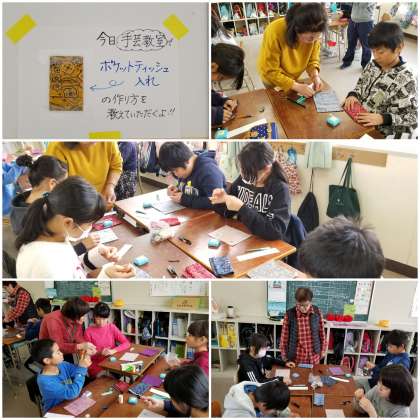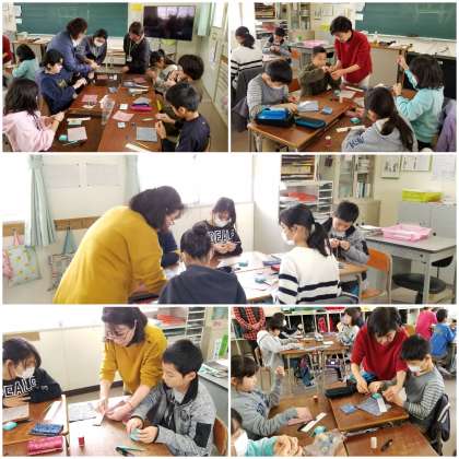 生涯学習「パッチワーク」の皆さんが、5年生に『ポケットティッシュ・ケース』の作り方を教えてくださっています。
