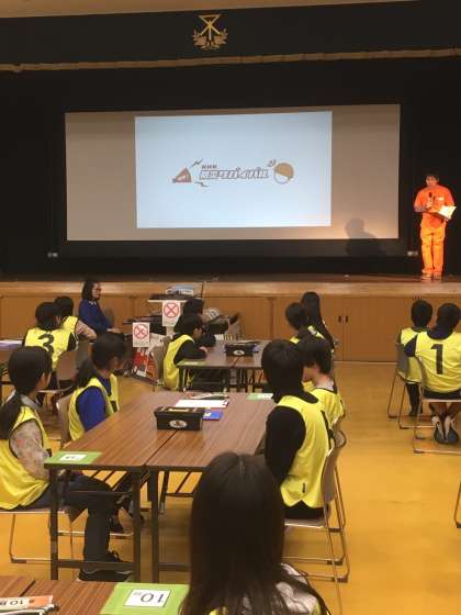 西淀川区民ホールで開催されている「挑戦!NHK防災サバイバル」に6年生が参加しています。