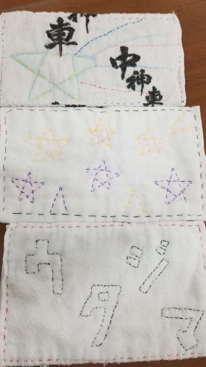 家庭科の時間に在校生へ贈る「ぞうきん」を縫っている6年生。