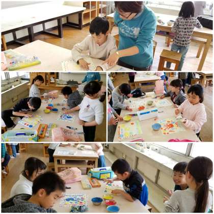 液体粘土に好きな絵の具を混ぜ、指や手で表現します。