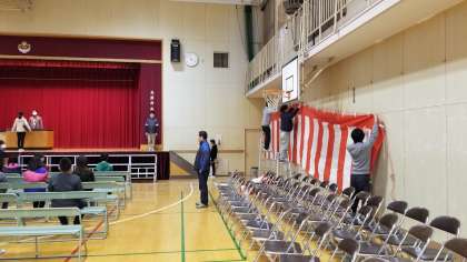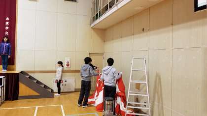 管理作業員と学生ボランティアが協力して「紅白幕」を講堂内に取り付けています。