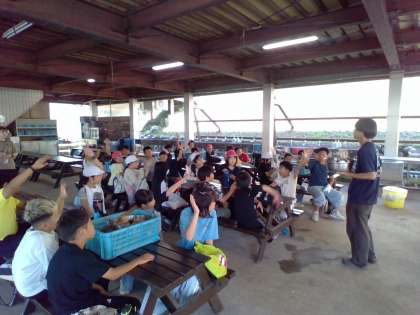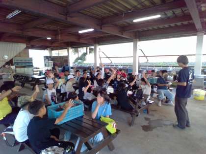 カレー作りです。宿舎の方の説明をしっかりと聞いています。