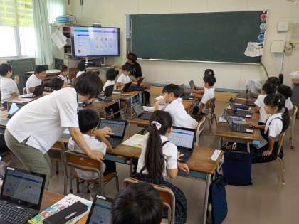 2学期から使っている学習者用端末で新しいアプリに挑戦している1年生。