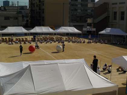 全学年で大玉を渡す練習では、紅白に分かれ、大きな赤玉と白玉を1年生から6年生に順に回しました。途中で、大玉が転がっていく場面も。