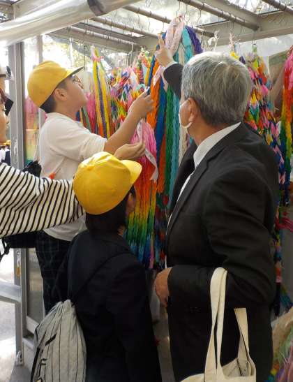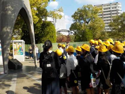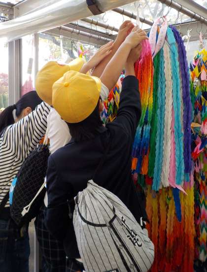 平和記念公園の「原爆の子の像」に千羽鶴を捧げます。