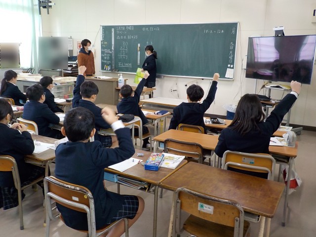 友だちが黒板に書いた回答を見ながら、みんなで答え合わせ。