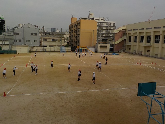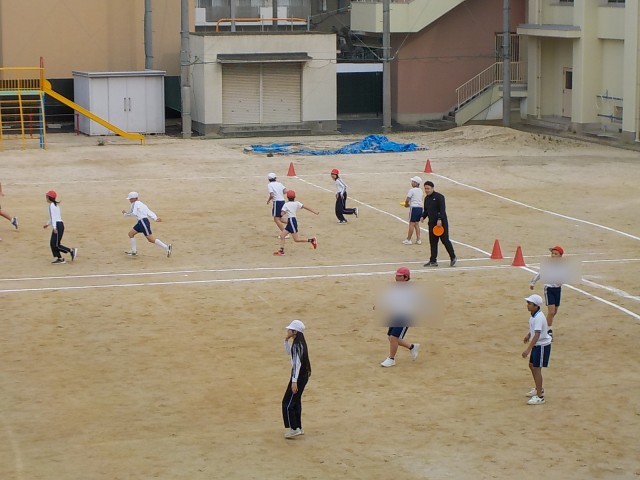 5年生が運動場でフリスビーを使ってのゲームをしていました。