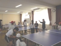 先生に上手に打ち返すコツをアドバイスしてもらっています。卓球が得意な先生とも勝負...