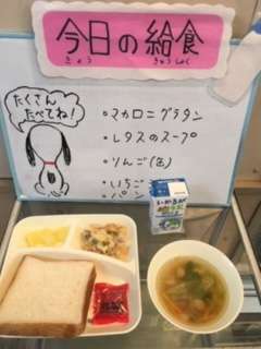 今日の給食は、パン 牛乳 マカロニグラタン レタスのスープ りんご いちごジャムです。