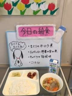 今日の給食は、ごはん 牛乳 まぐろのオーロラ煮 じゃがいもと野菜の含め煮 キャベツの梅風味です。
