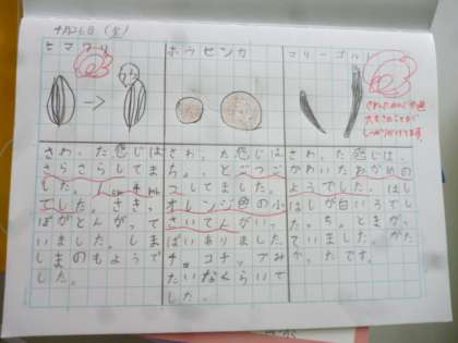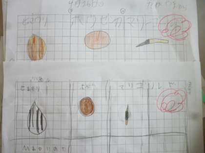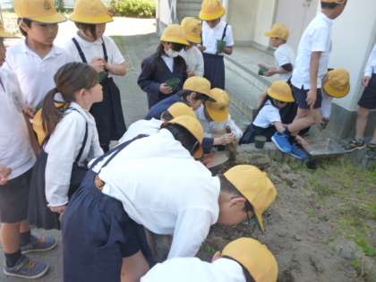 理科では植物の成長について学習するために、ひまわり、ホウセンカ、マリーゴールドを植えます。まずは、種の観察から・・・手ざわりや形・色のちがいなど、自分の手や目をつかって観察しました。そのことをノートに記録しました。そしていよいよ種まきです。一人ひとりビニルポットを持って種を植えました。いつごろ芽が出るんだろう・・・