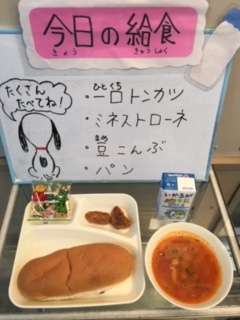 今日の給食は、レーズンパン 牛乳 一口トンカツ ミネストローネ 豆こんぶです。